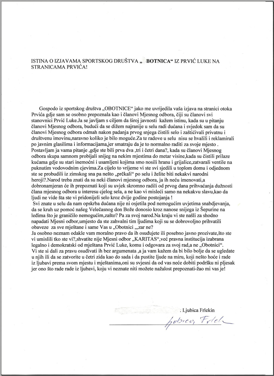 Telefonski ,noc prije hrbok botnice pozvao je clanove i mijestane na ciscenje glavne ulice od rive do ducana poste i ambulante.Odazvalo se dvadesetak clanova i simpatizera,ali nitko iz mijesnog odbora.Poslije akcije bila je i mala zakuska pa i malo vremena za skijanje po glavnoj ulici.